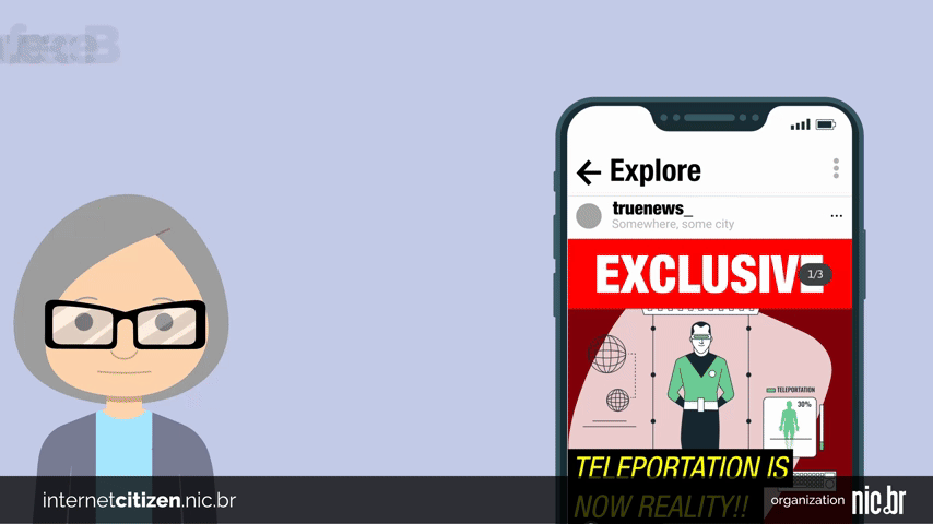 In the first scene, a woman sees a sensationalist news story on social media and considers sharing it. At the top of the screen, a headline appears: “Be careful not to share fake news!”. A warning symbol then appears next to the headline.