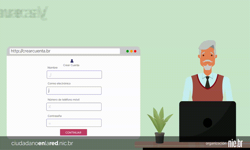 El video comienza con la frase "¿Vas a crear una cuenta en un sitio web?" y muestra a un hombre de cabello gris con barba frente a una computadora. Está completando campos en un sitio web para crear una cuenta.