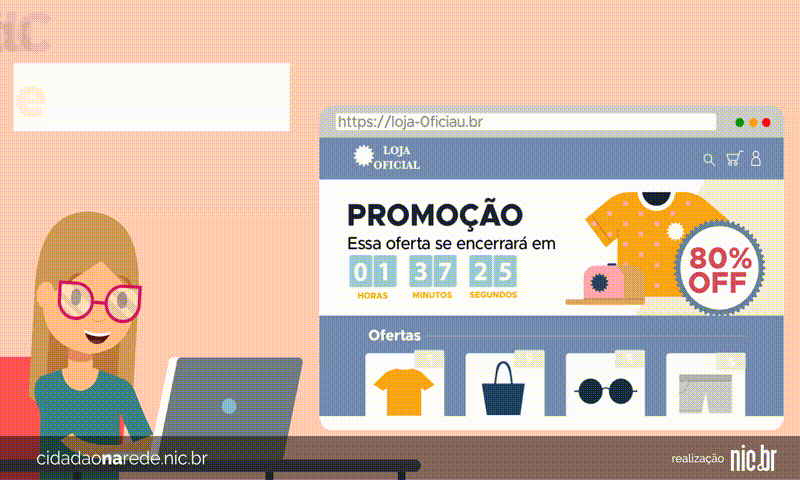 Na primeira cena, uma menina está usando o computador e acessa um site de roupas em promoção. No topo da tela, surge a frase: “Cuidado para não cair em golpes.”